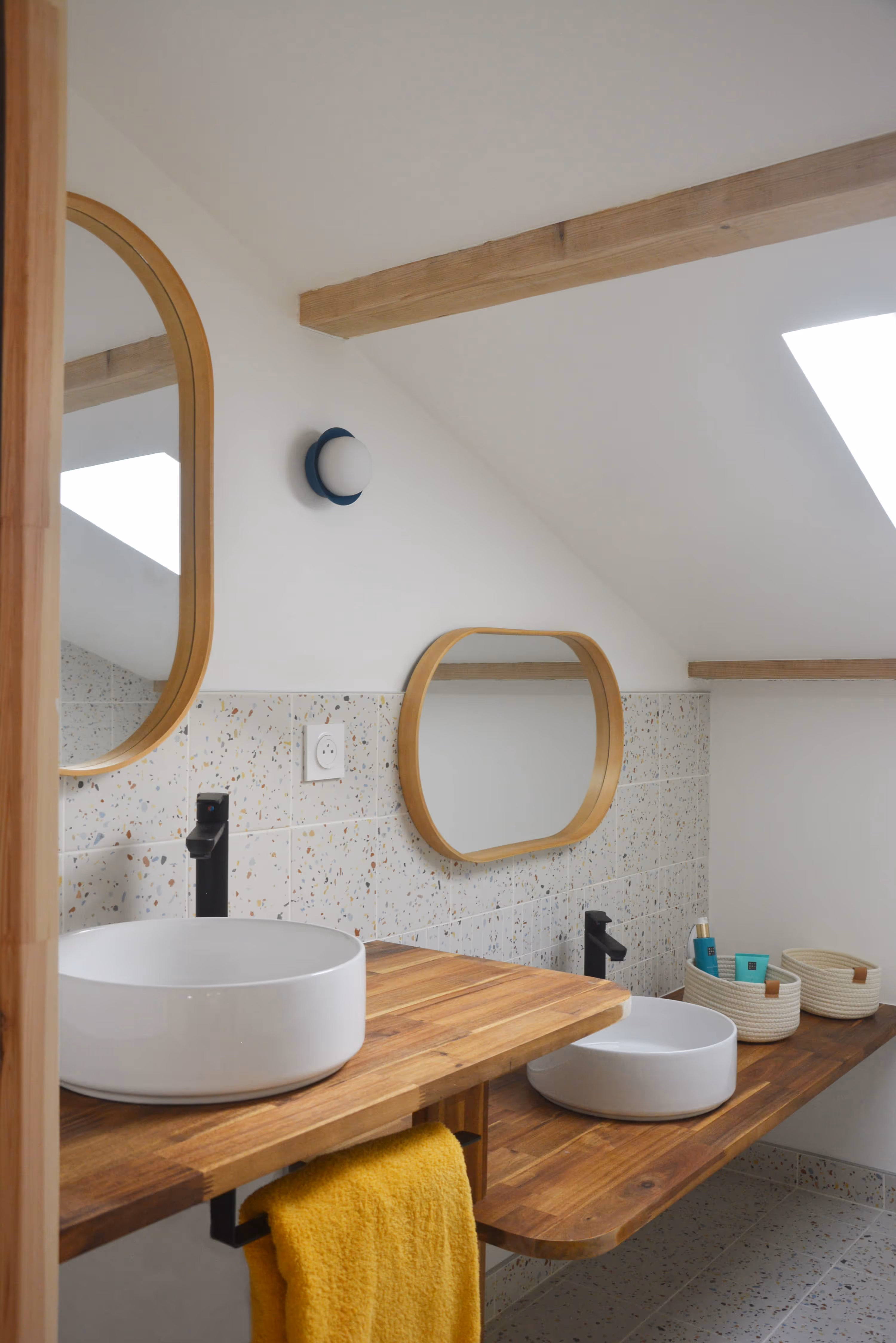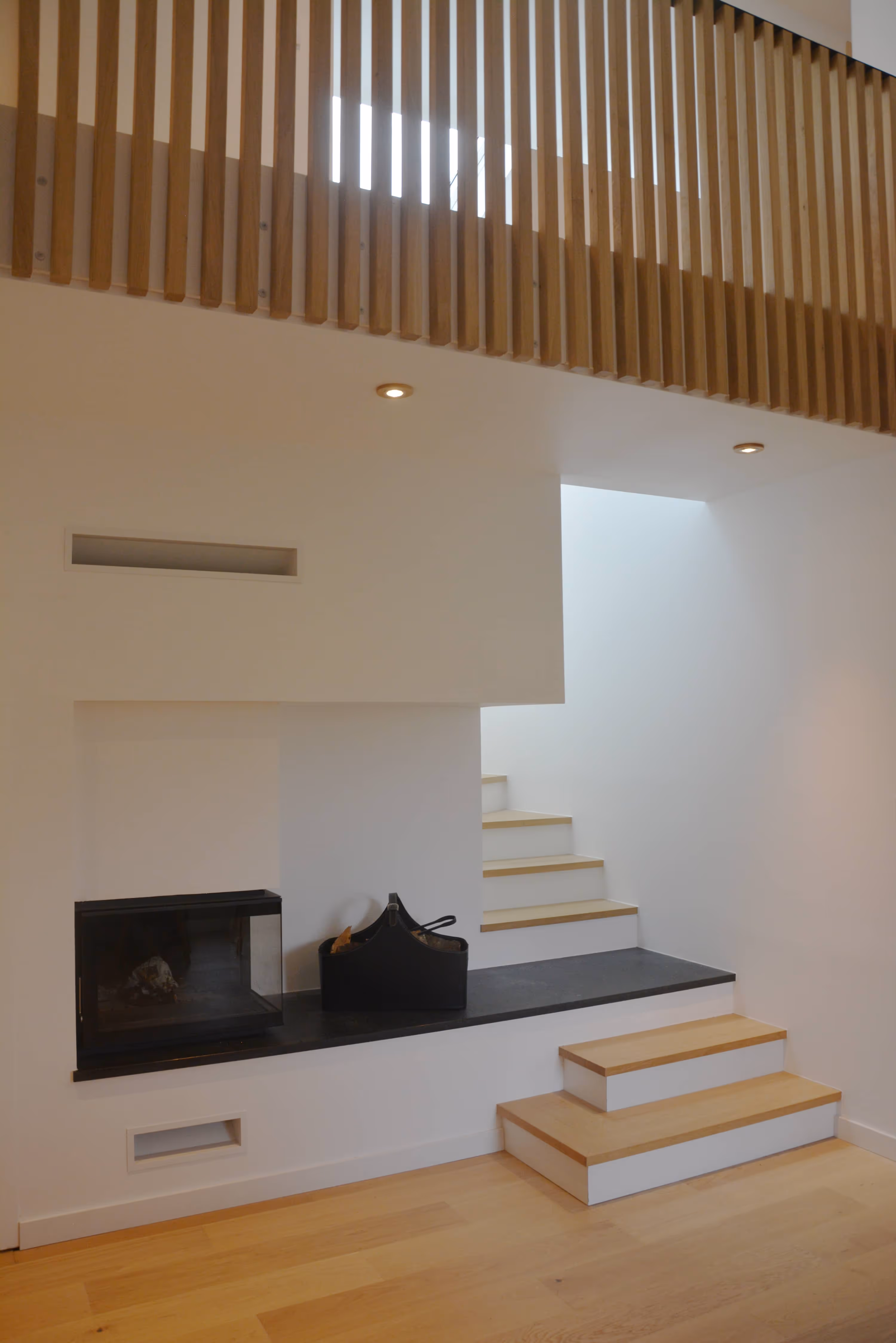 Les ouvertures sont agrandies créant une ambiance chaleureuse et lumineuse. L’aménagement intérieur est composé de matériaux naturels comme le bois et la pierre avec une touche de couleur, alors qu’en façade, une isolation par l’extérieur optimise le confort de la maison tout en s'intégrant parfaitement dans son environnement.